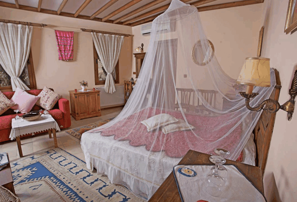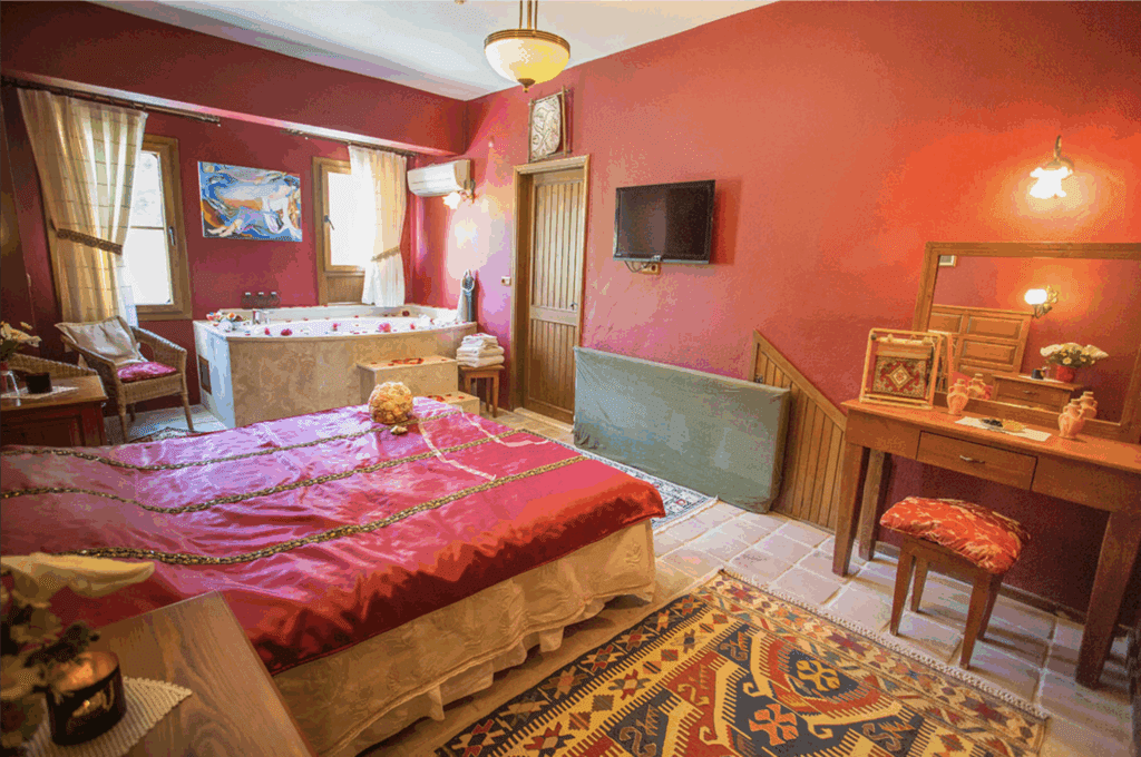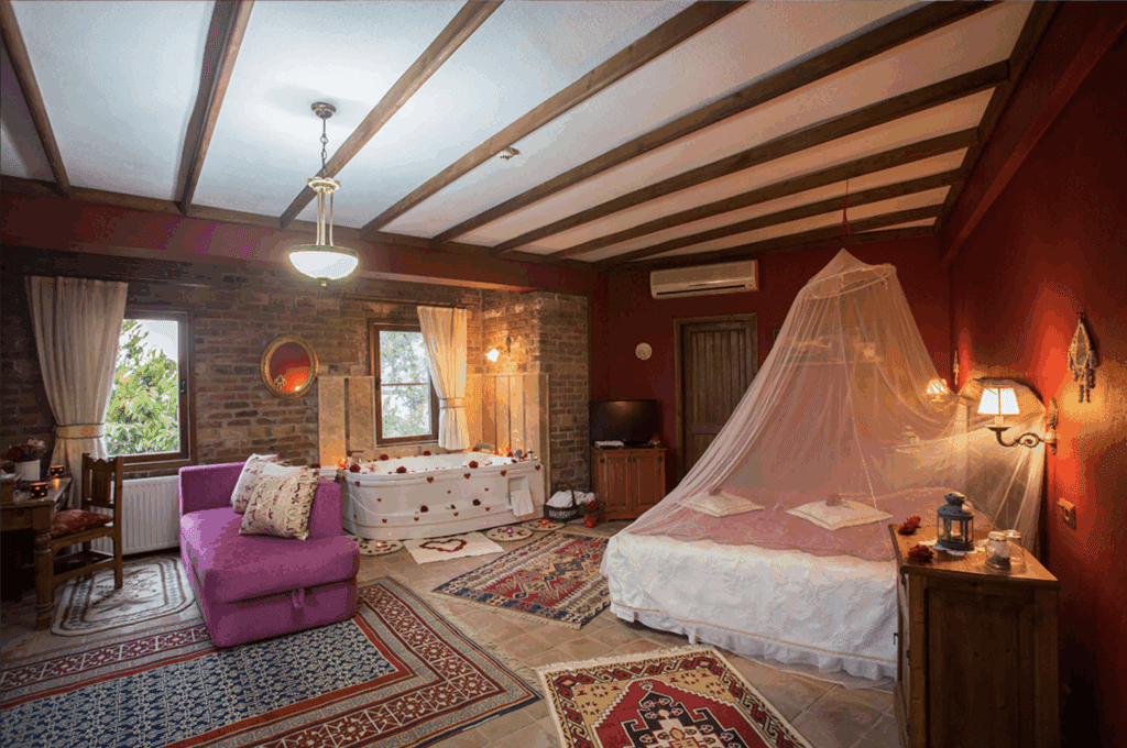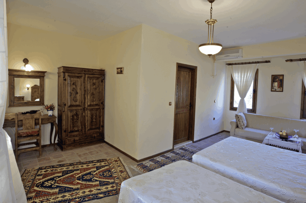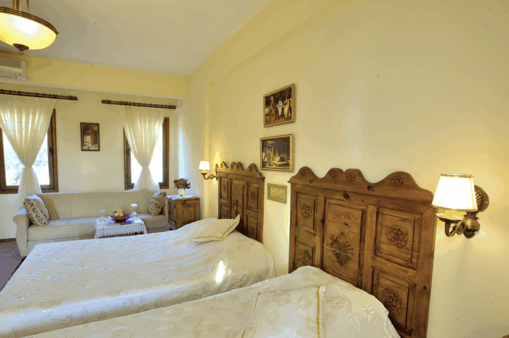 Süit Oda ekstra geniş (40 m²) olup, kral boy yatak, çift kişilik küvetli geniş mermer banyo, jakuzi, özel balkon, şömine, oturma alanı ve çalışma masası/çalışma alanı ile donatılmıştır. Bu odalar geleneksel tarzda benzersiz bir şekilde dekore edilmiştir. Her iki odanın tavanları da geleneksel ahşap tasarımla dekore edilmiştir.