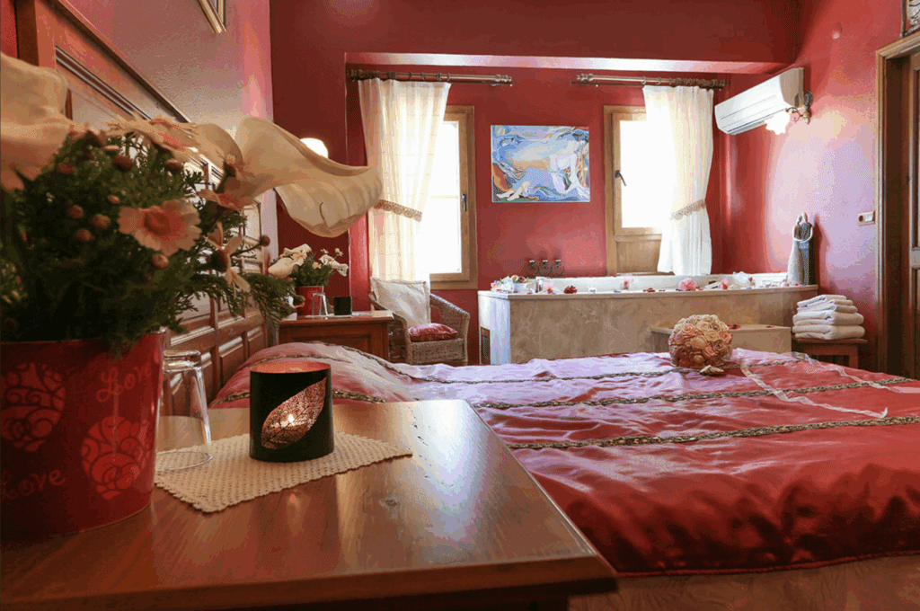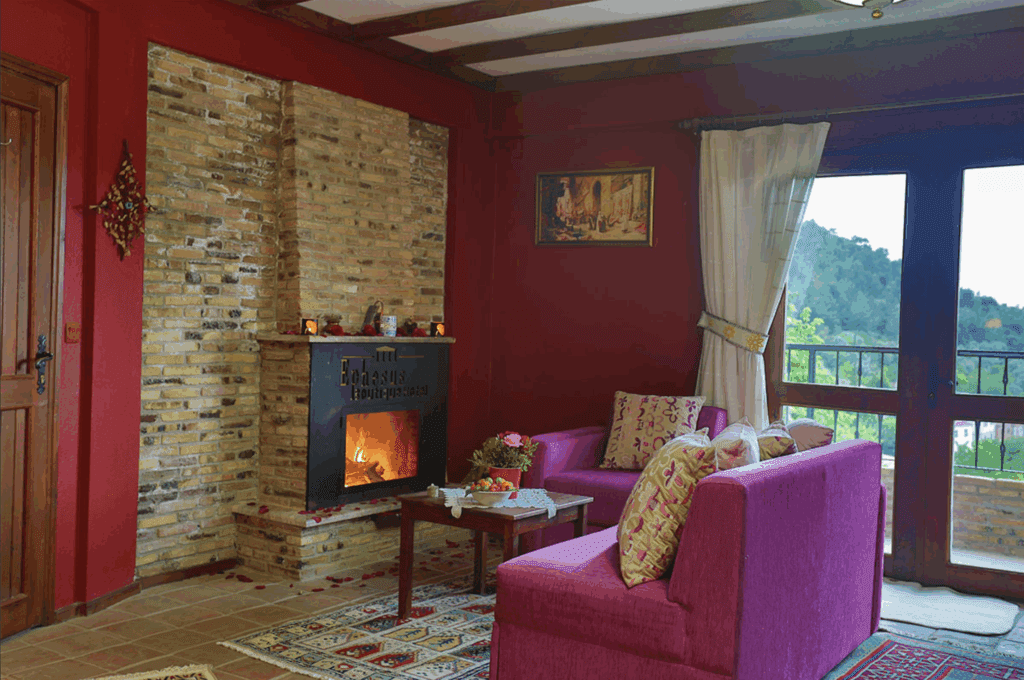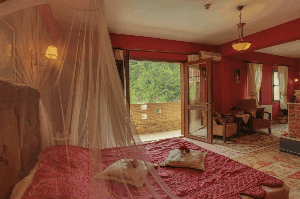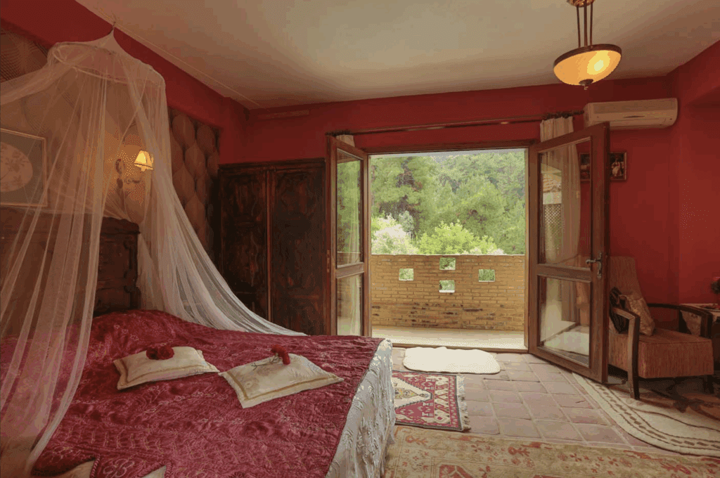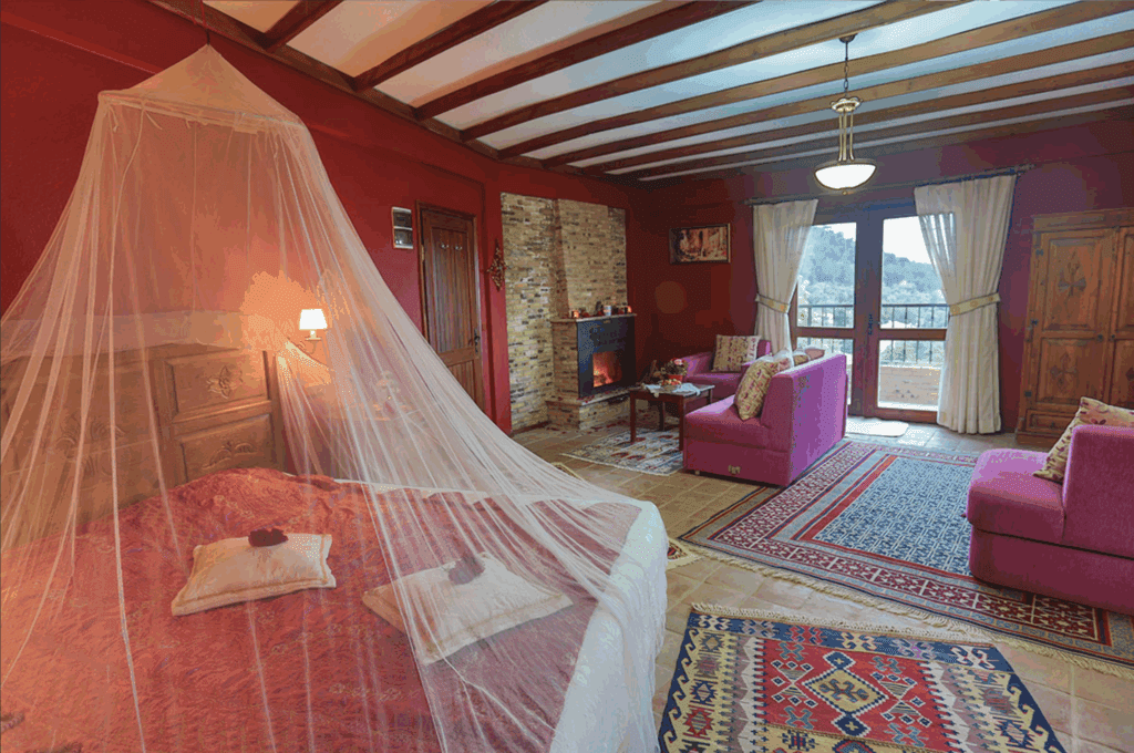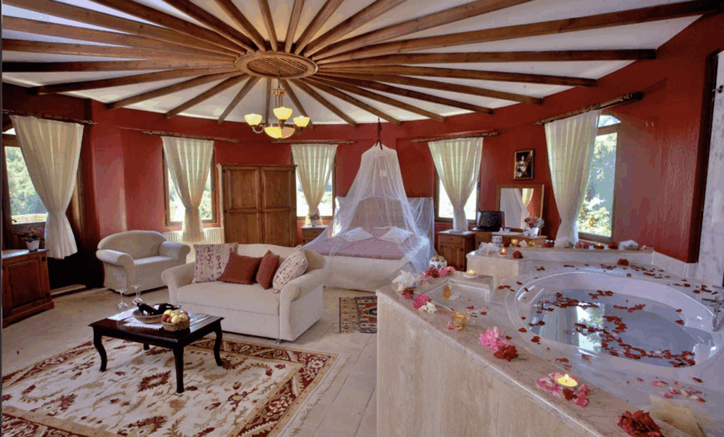 Süit Oda ekstra geniş (40 m²) olup, kral boy yatak, çift kişilik küvetli geniş mermer banyo, jakuzi, özel balkon, şömine, oturma alanı ve çalışma masası/çalışma alanı ile donatılmıştır. Bu odalar geleneksel tarzda benzersiz bir şekilde dekore edilmiştir. Her iki odanın tavanları da geleneksel ahşap tasarımla dekore edilmiştir.