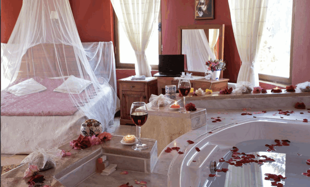 Yeni Balayı Süiti, king boy yatak, çift kişilik küvetli geniş mermer banyo, jakuzi, özel balkon, şömine, oturma alanı ve çalışma masası/çalışma alanı ile donatılmış ekstra geniş bir odadır (60 m²). Bu odalar geleneksel tarzda benzersiz bir şekilde dekore edilmiştir. Odanın tavanları geleneksel ahşap tasarımla dekore edilmiştir.