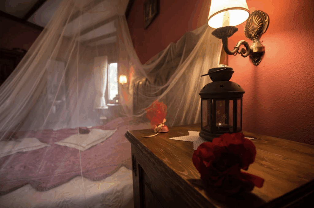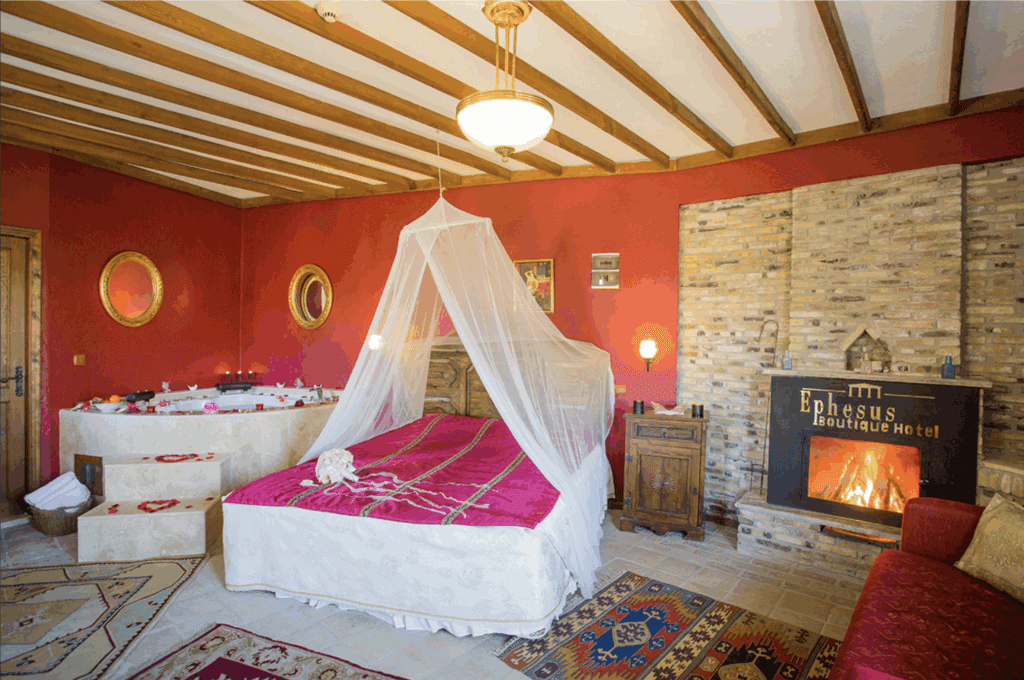 Balayı Süiti, king boy yatak, çift kişilik küvetli geniş mermer banyo, özel balkon, şömine, oturma alanı ve çalışma masası/çalışma alanı ile donatılmış ekstra geniş bir odadır (48 m²). Bu odalar geleneksel tarzda benzersiz bir şekilde dekore edilmiştir. Odaların tavanları geleneksel ahşap tasarımla dekore edilmiştir.