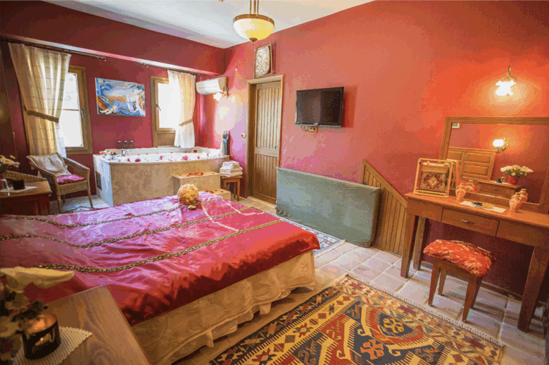 Yeni Balayı Süiti, king boy yatak, çift kişilik küvetli geniş mermer banyo, jakuzi, özel balkon, şömine, oturma alanı ve çalışma masası/çalışma alanı ile donatılmış ekstra …