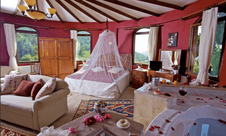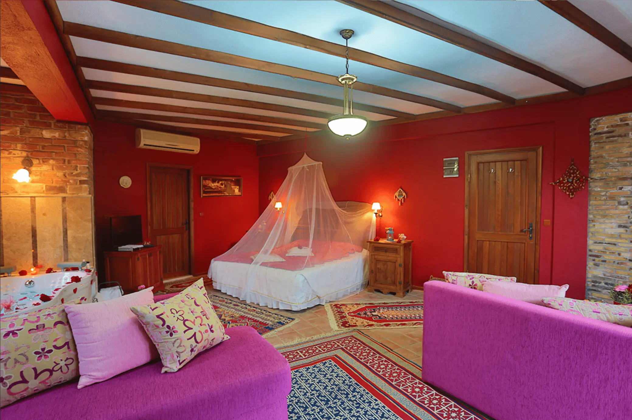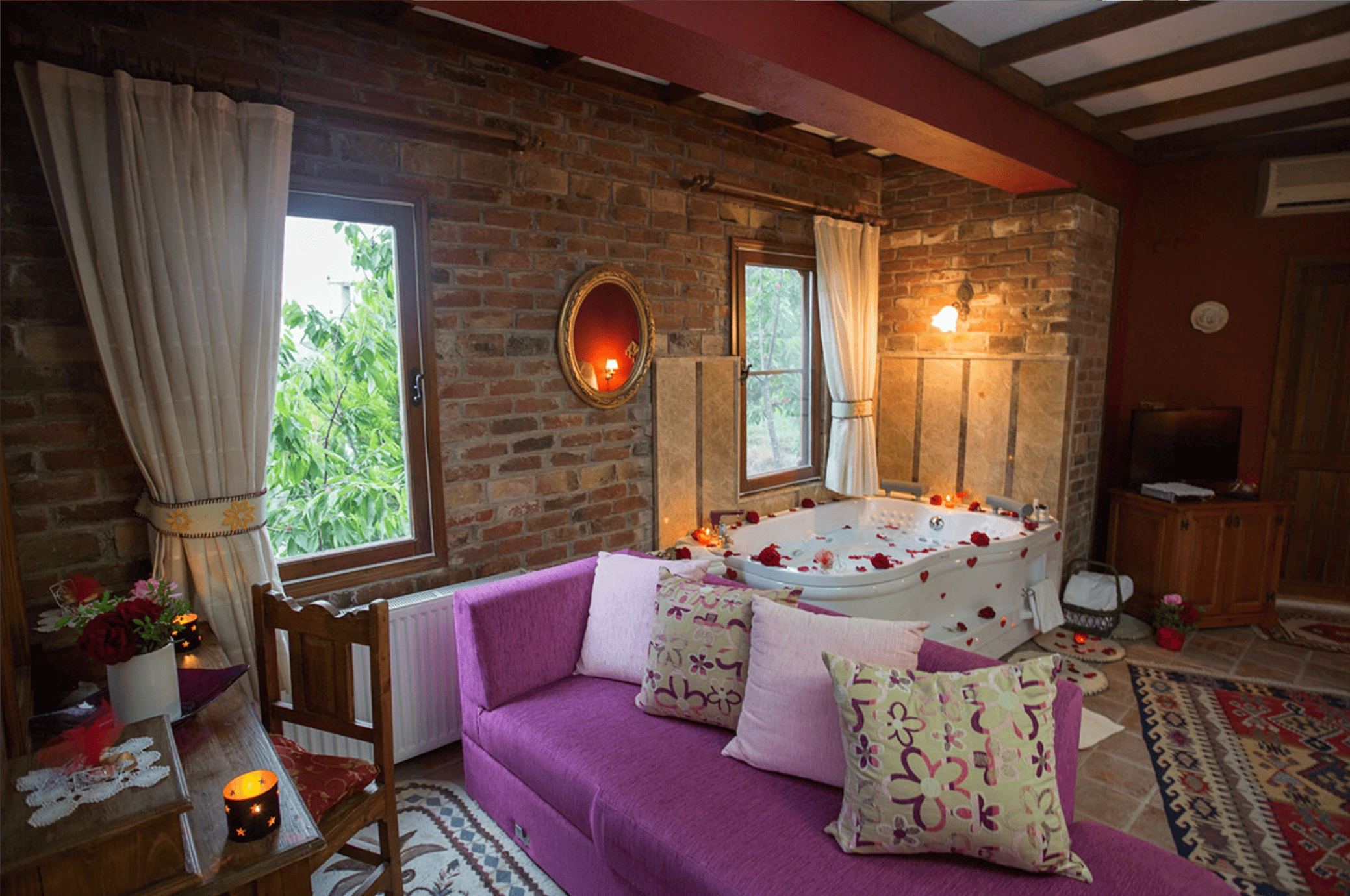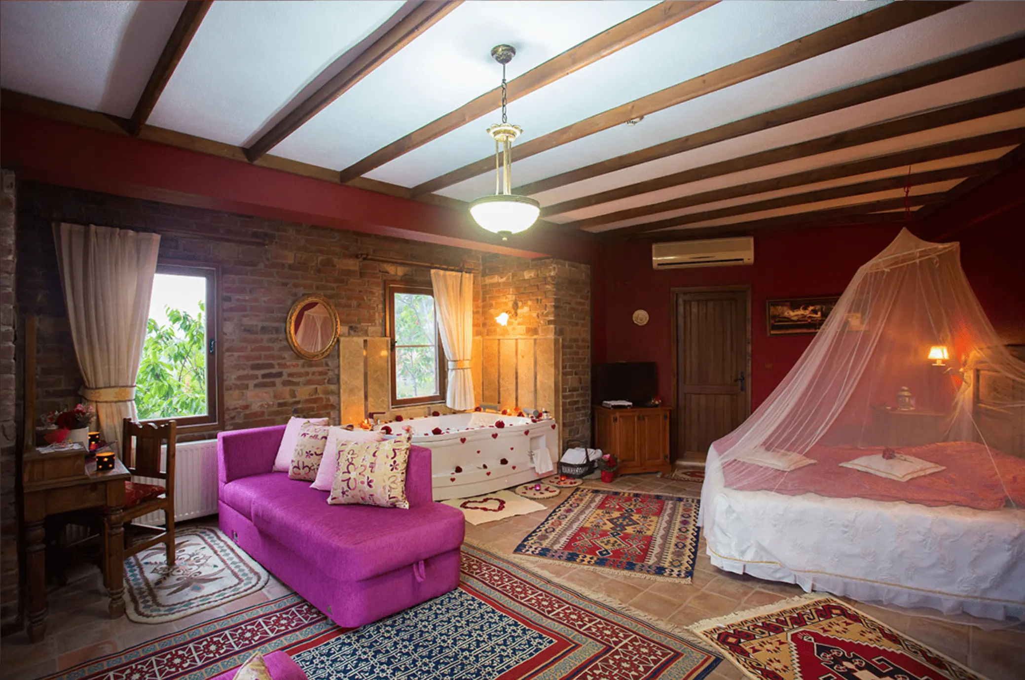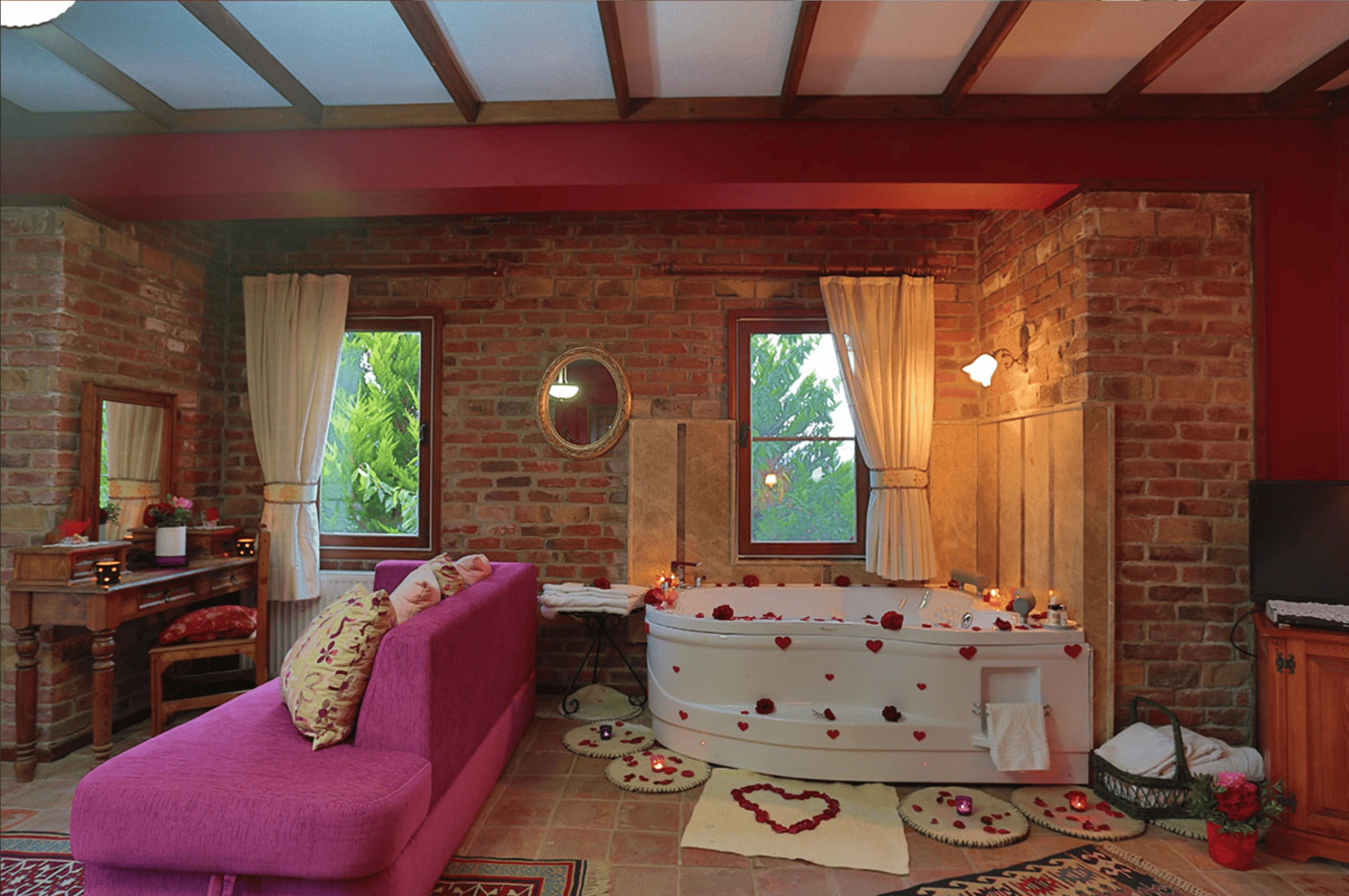 Yeni Balayı Süiti, king boy yatak, çift kişilik küvetli geniş mermer banyo, jakuzi, özel balkon, şömine, oturma alanı ve çalışma masası/çalışma alanı ile donatılmış ekstra geniş bir odadır (60 m²). Bu odalar geleneksel tarzda benzersiz bir şekilde dekore edilmiştir. Odanın tavanları geleneksel ahşap tasarımla dekore edilmiştir.