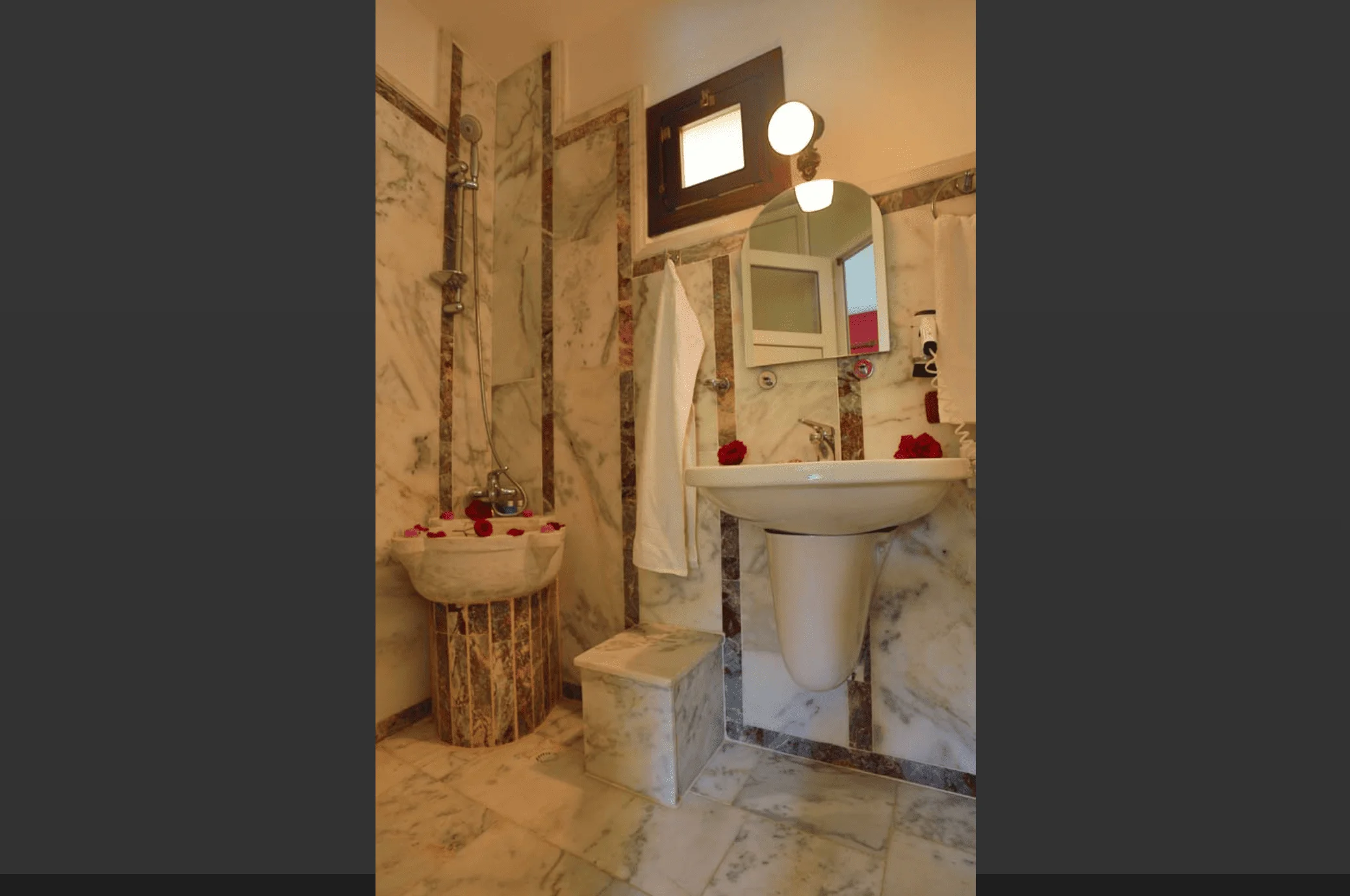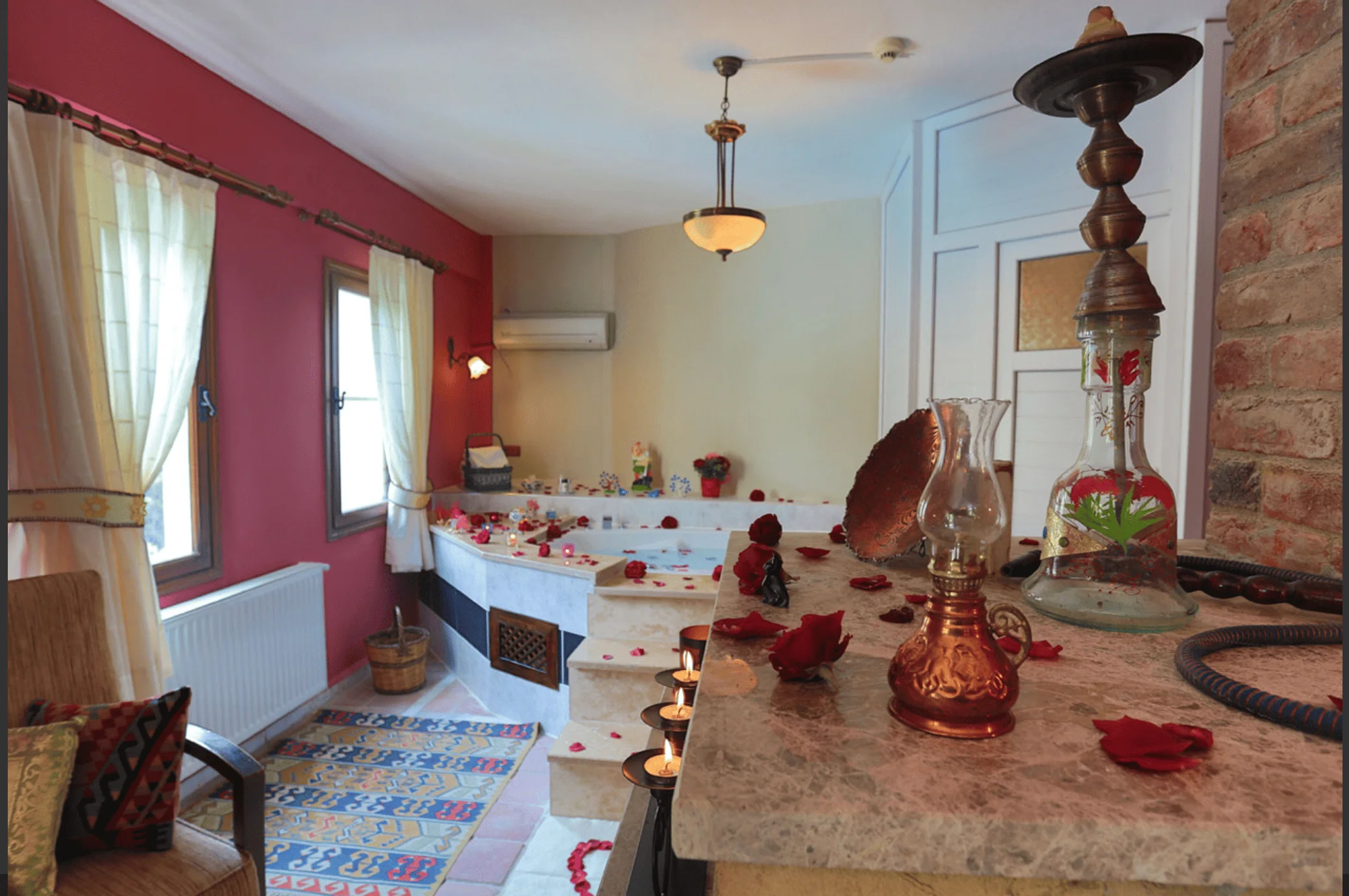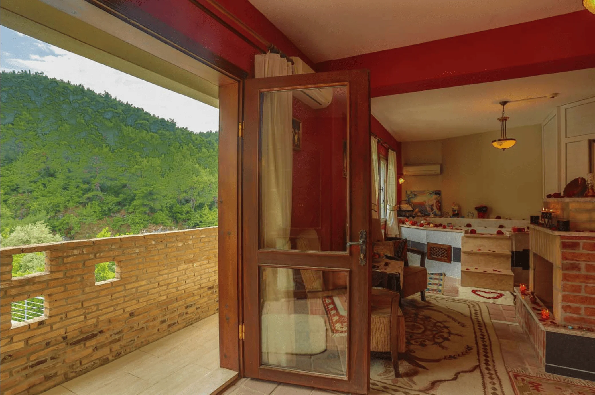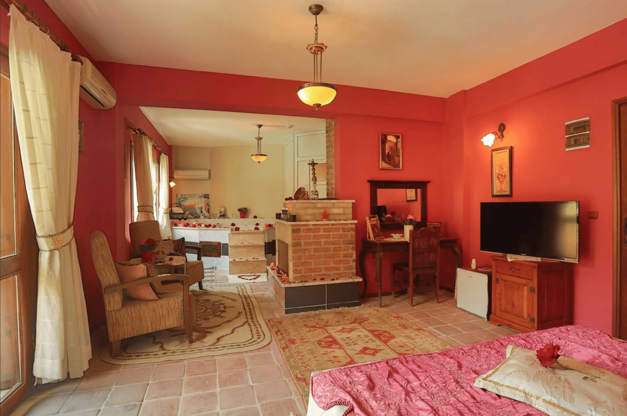 Süit Oda ekstra geniş (40 m²) olup, kral boy yatak, çift kişilik küvetli geniş mermer banyo, jakuzi, özel balkon, şömine, oturma alanı ve çalışma masası/çalışma alanı ile donatılmıştır. Bu odalar geleneksel tarzda benzersiz bir şekilde dekore edilmiştir. Her iki odanın tavanları da geleneksel ahşap tasarımla dekore edilmiştir.